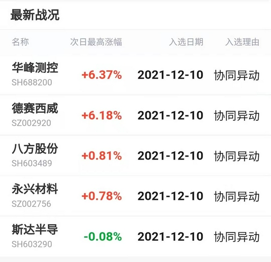 如图所示,上周五共计5只股票入选!尾盘掘金掘出优质个股,今日其中四只上涨。盘中半导体检测设备龙头华峰测控、国际知名移动出行科技公司德赛西威双双涨超6%,电踏车龙头八方股份、特种材料企业永兴材料涨近1%。